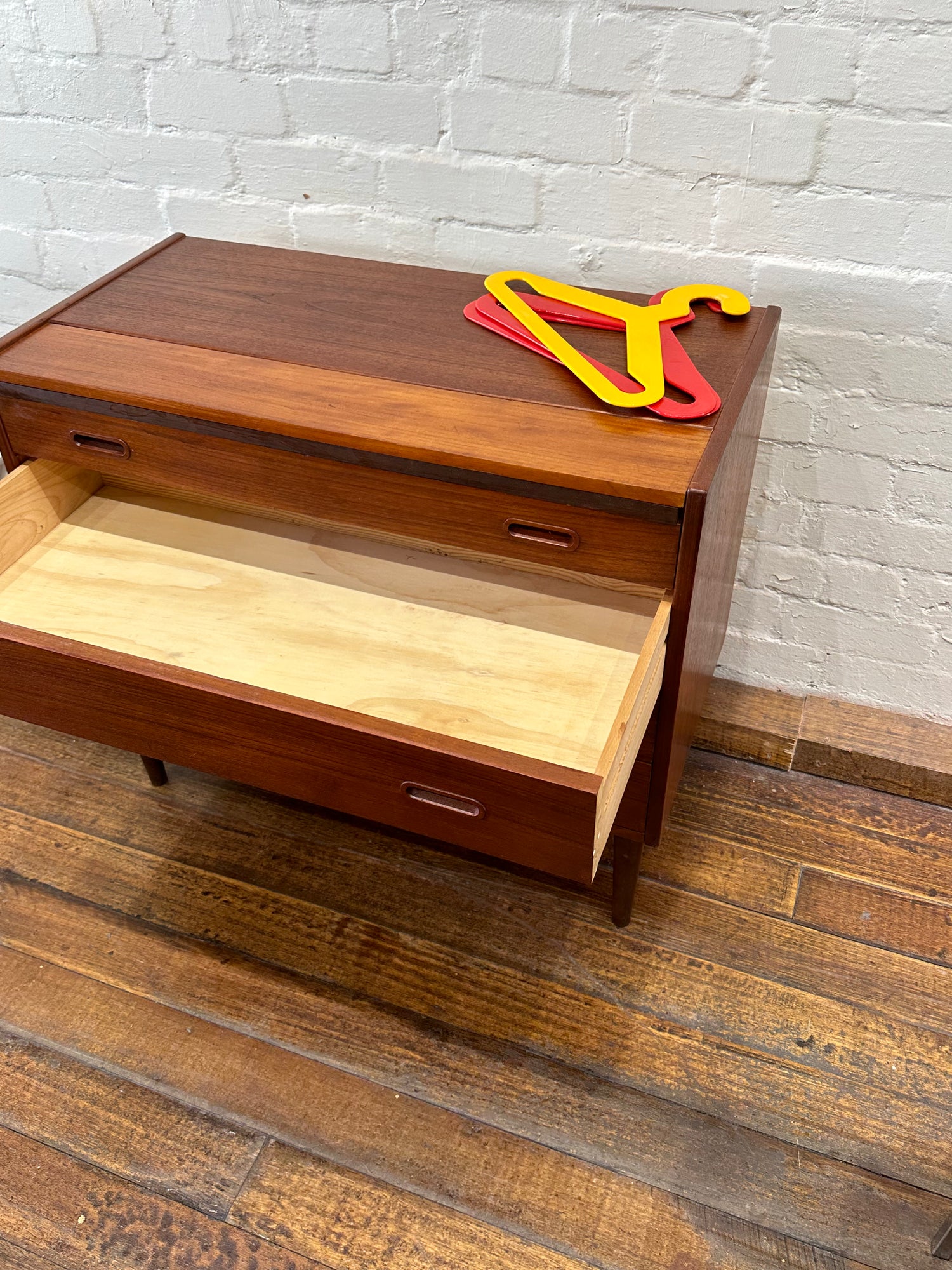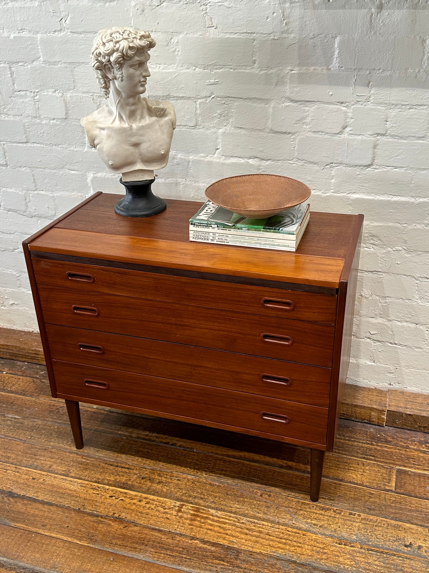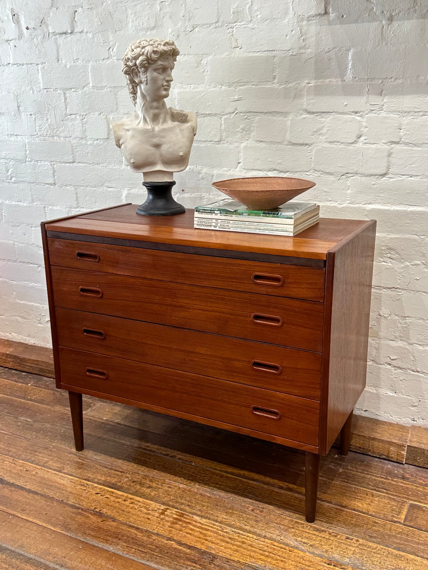 Mid century teak chest of drawers with sculpted recessed handles and four tapered legs.