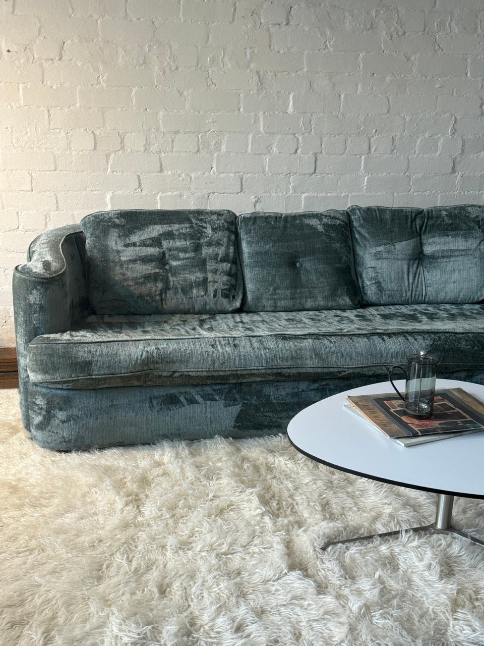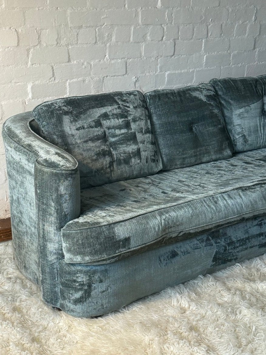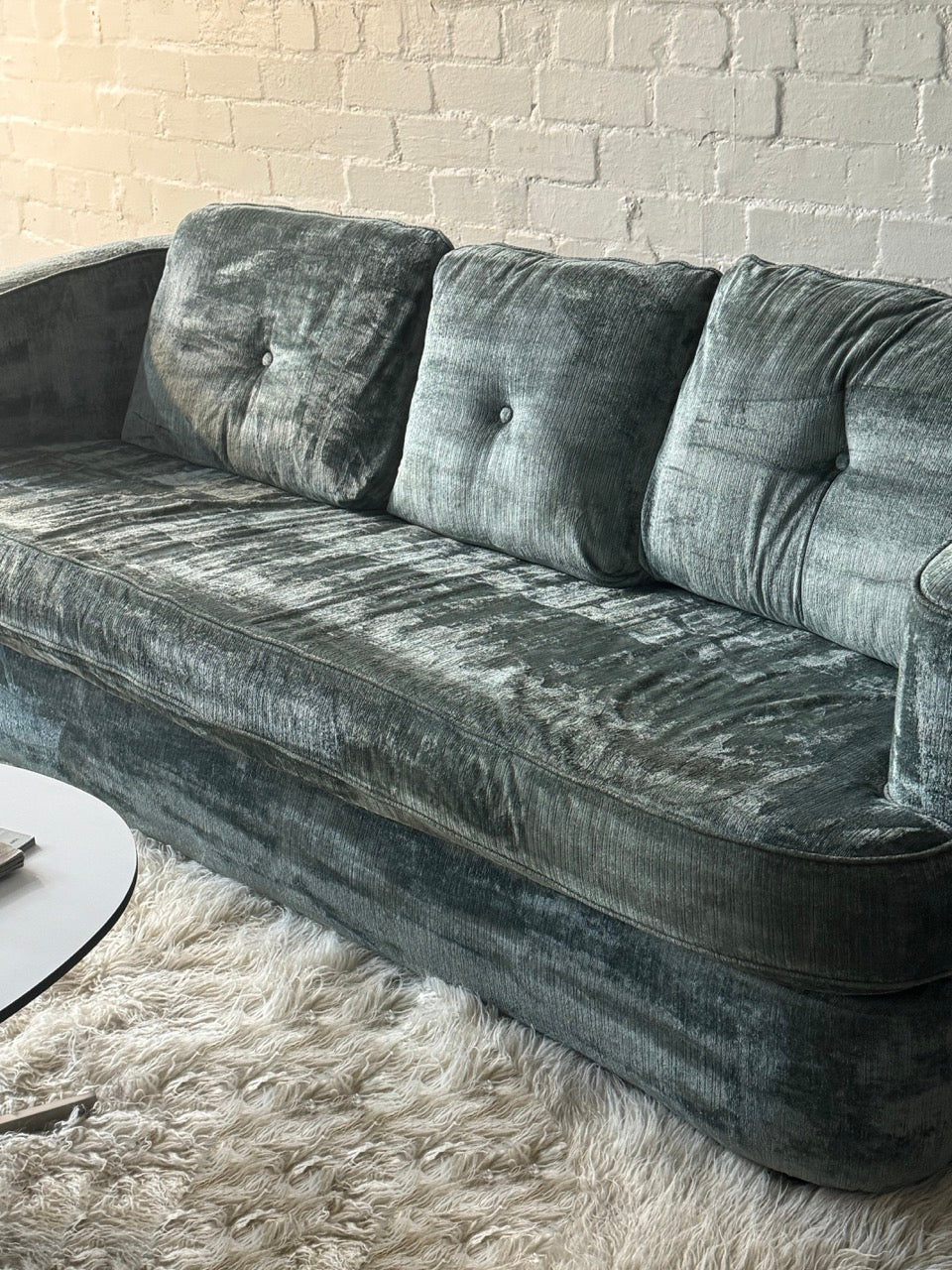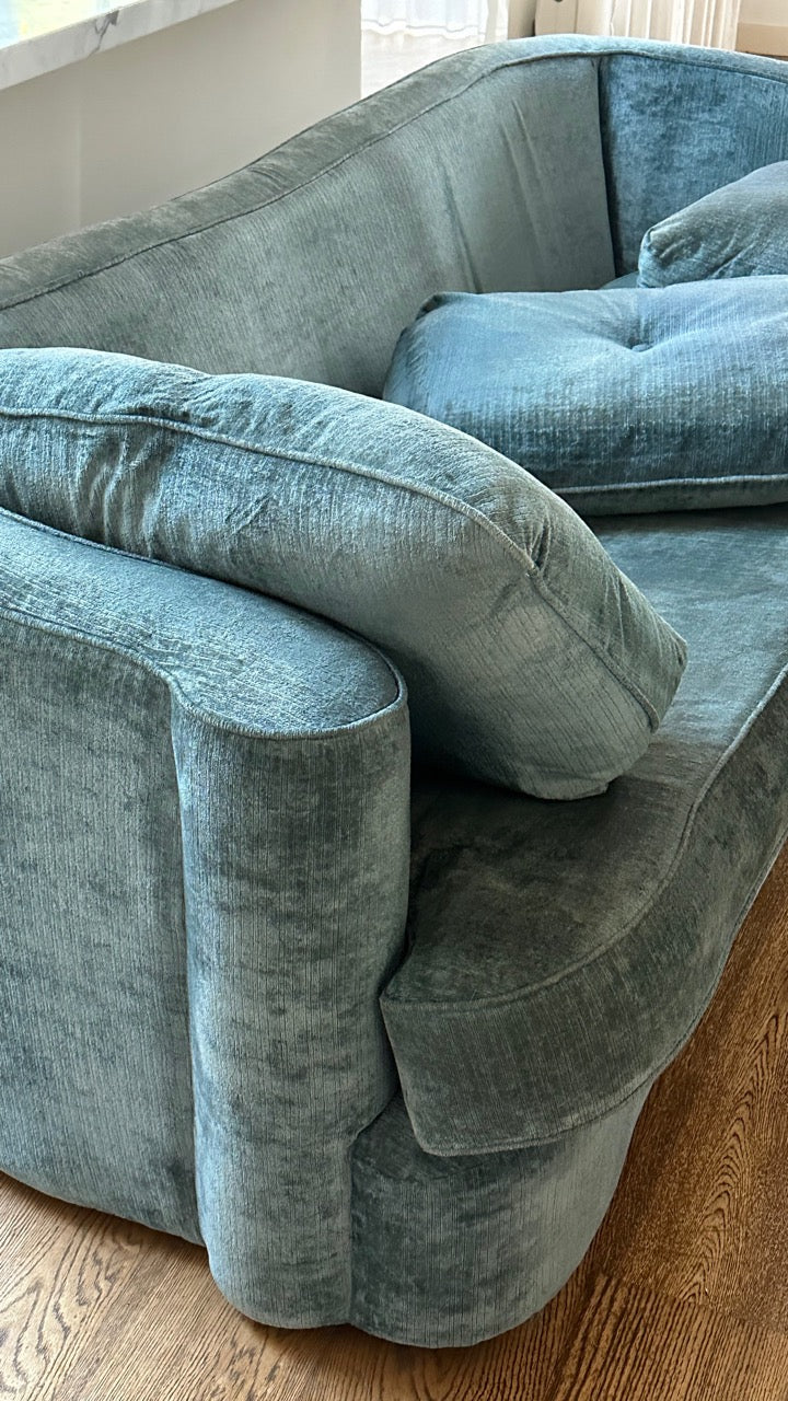blue velvet chenille with curved arms that are the same height as the back of the sofa