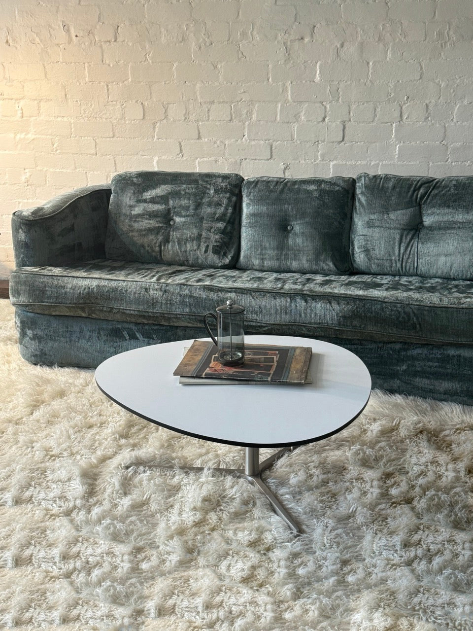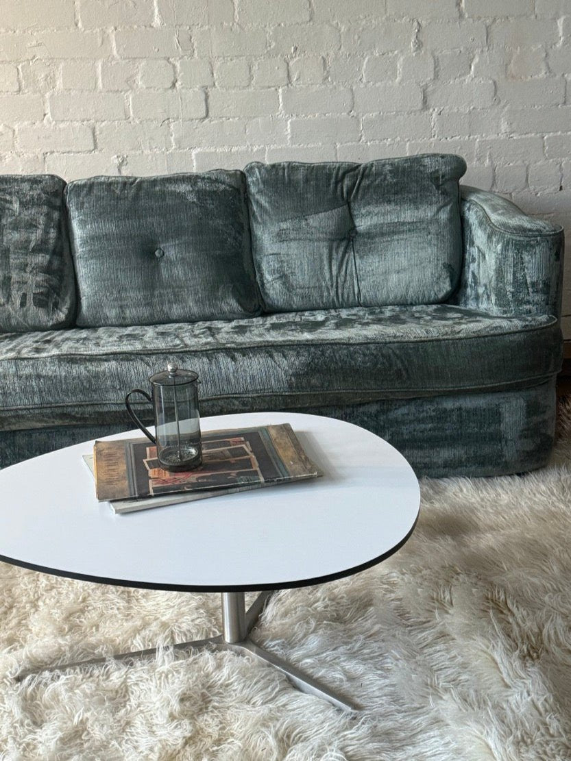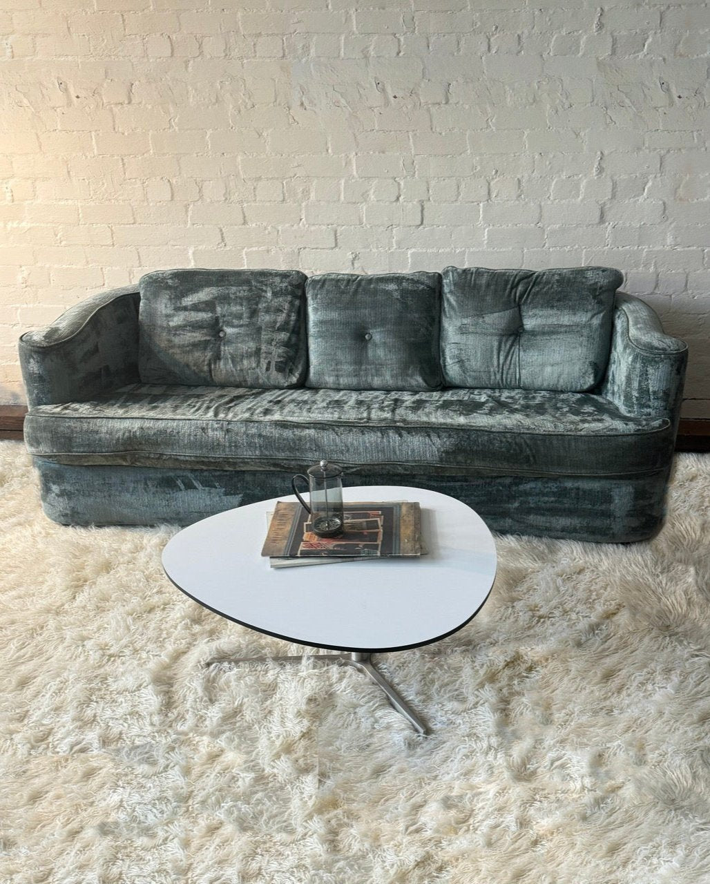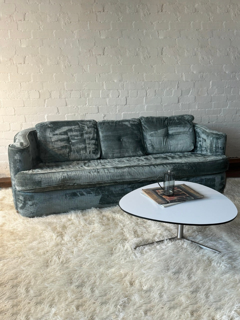 blue velvet chenille with curved arms that are the same height as the back of the sofa
