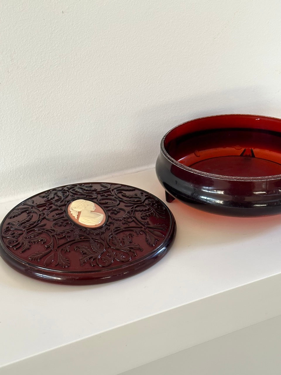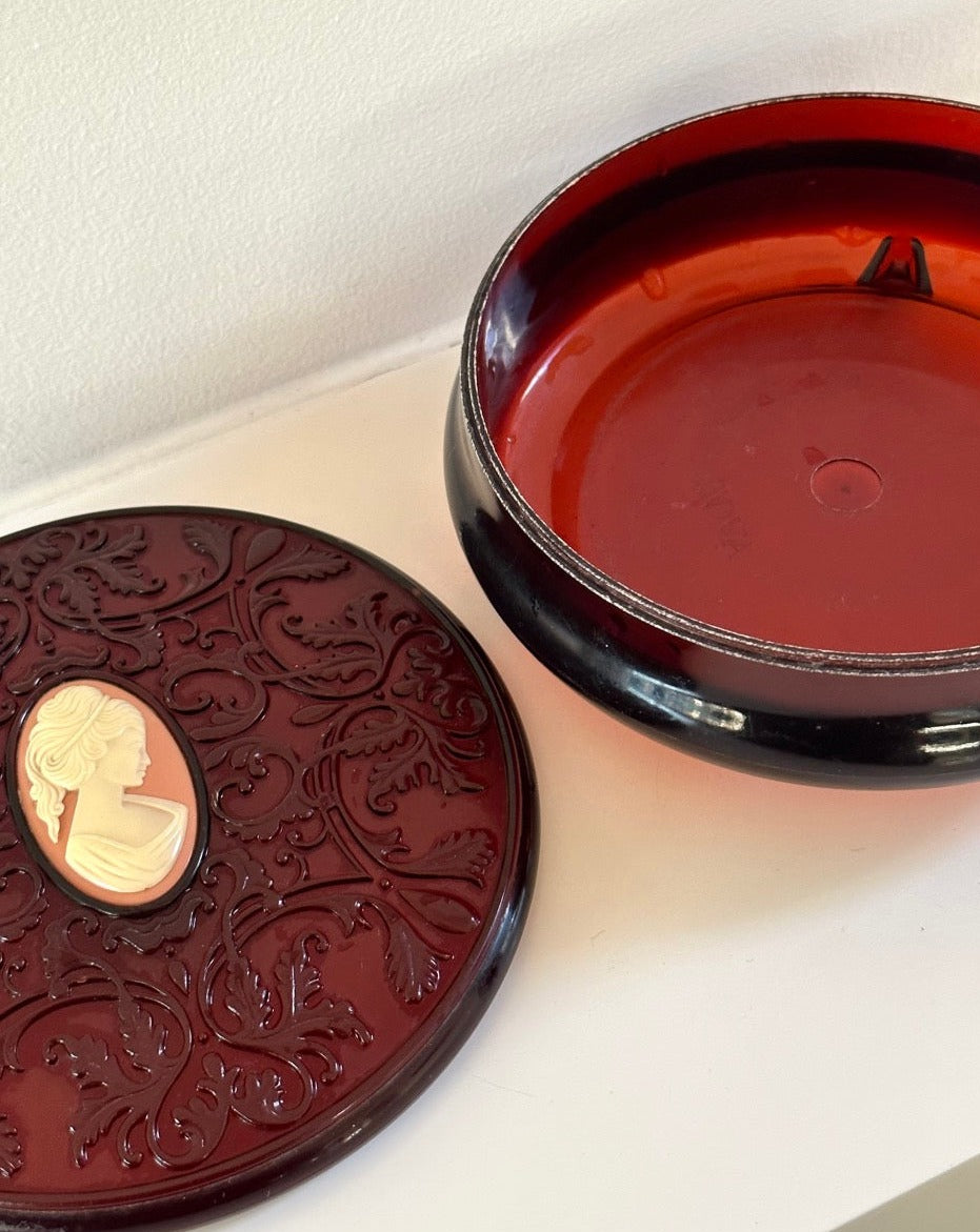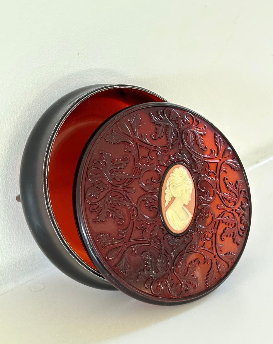 Made of moulded plastic and features an oval cameo, surrounded by raised designs. The lid comes off the round box to reveal a storage spot for jewellery, trinkets or other items. This item has 3 plastic feet around the outer edge.