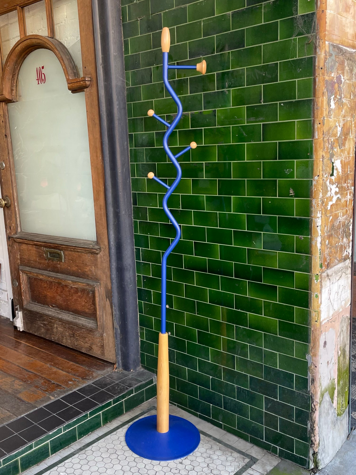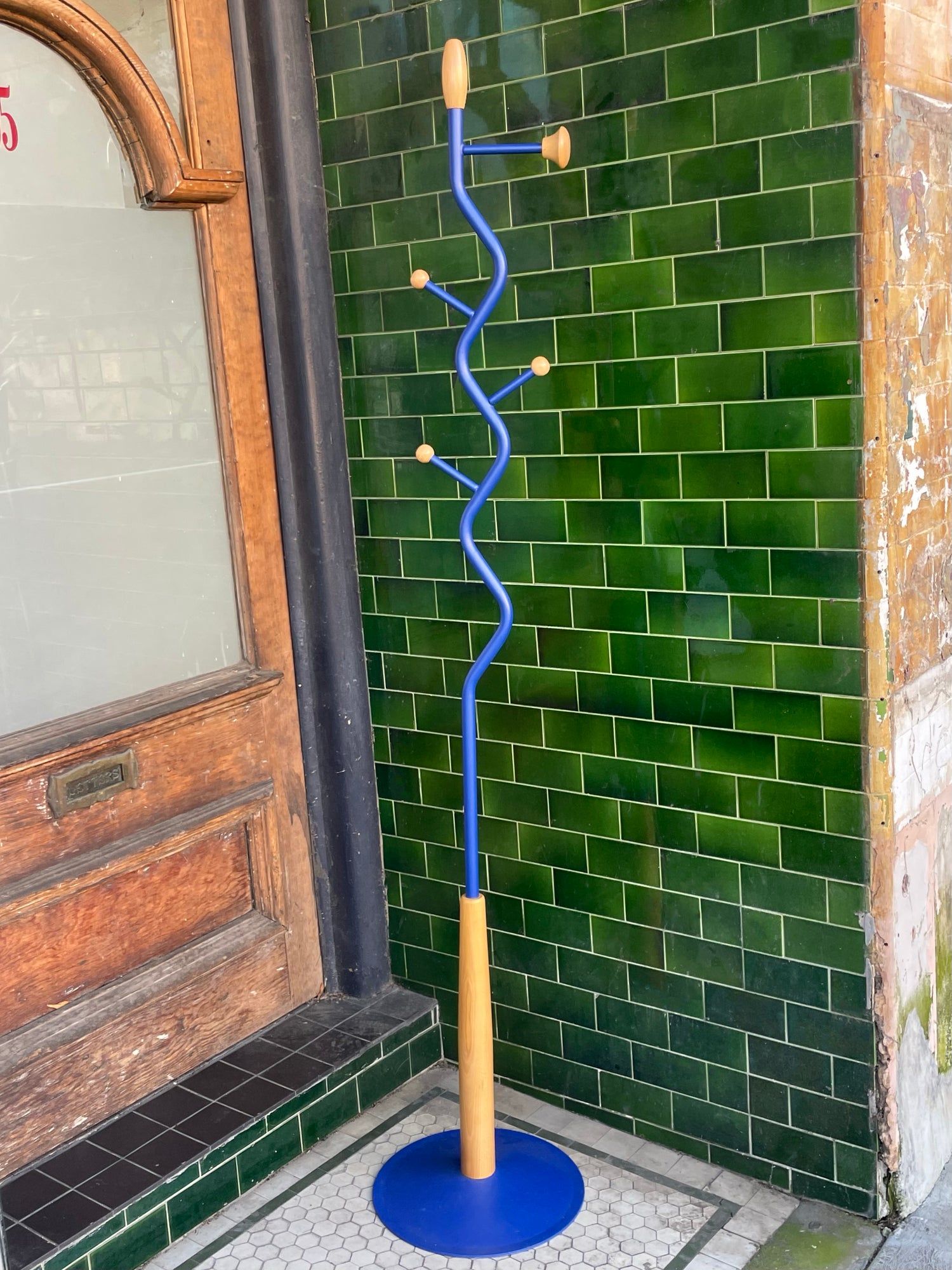 Cobalt blue coat stand with light wood accents.