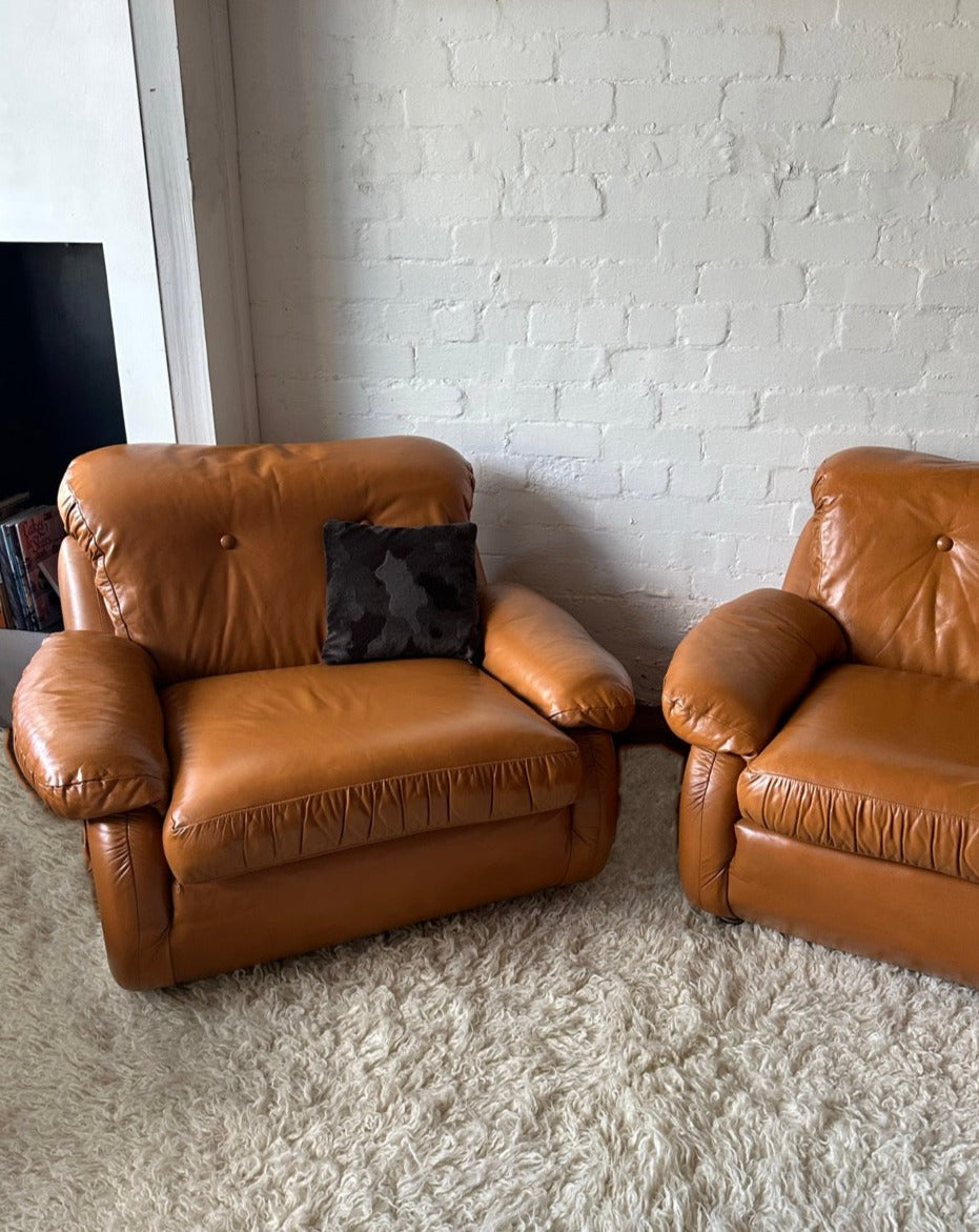 Incredibly comfortable, made of soft leather. Thickly padded with a large seating area and buckle detail to the sides and back of each chair.