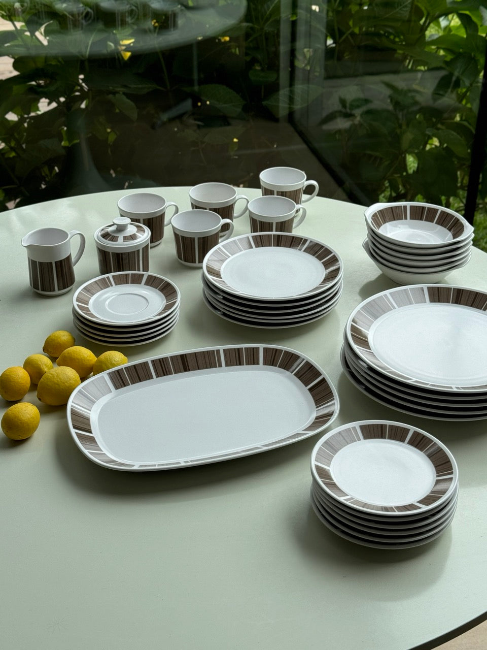 Includes 1 platter, 5 dinner plates, 6 bowls, 6 salad plates, 6 side plates as well as 5 cups, 5 saucers, 1 sugar bowl with lid, 1 milk jug