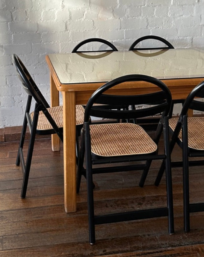 Good vintage condition. Rattan is in excellent condition. Some light marks to the wood but does not affect overall aesthetic.