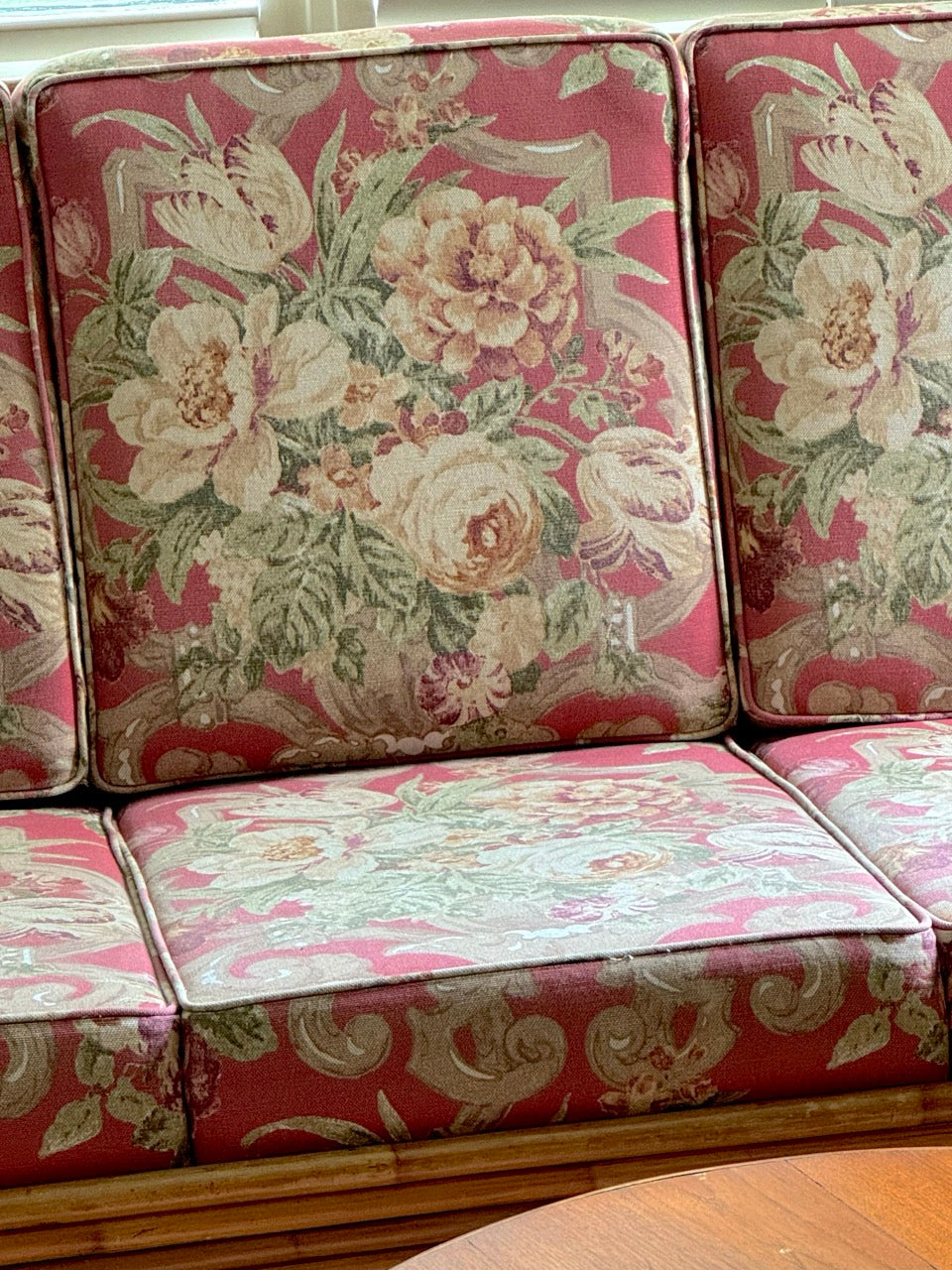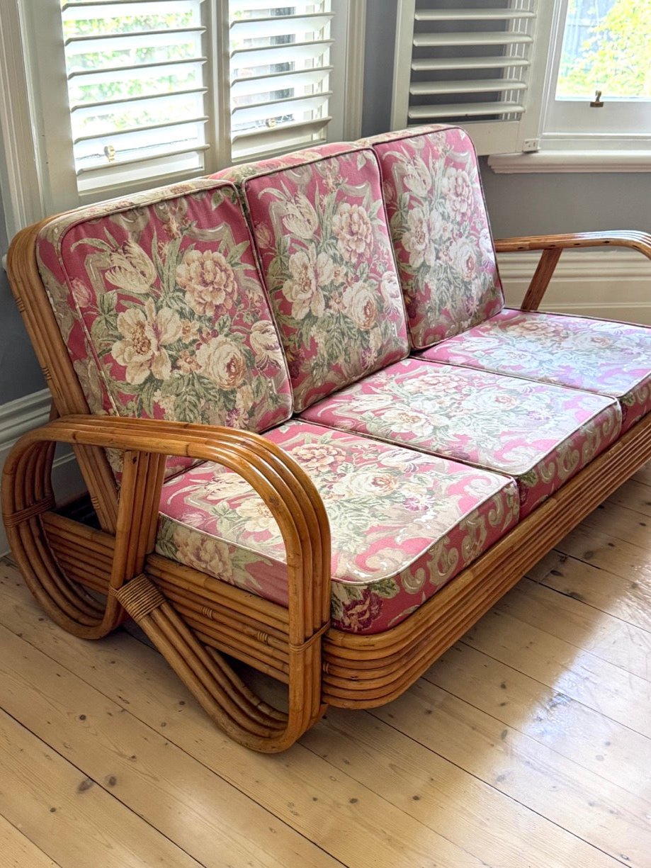 Upholstery is in great condition, with minor wear consistent with age. Cushions are filled with dense foam with no sagging and hold their shape well. Rattan is in great condition for it's age. No major wear or issues.
