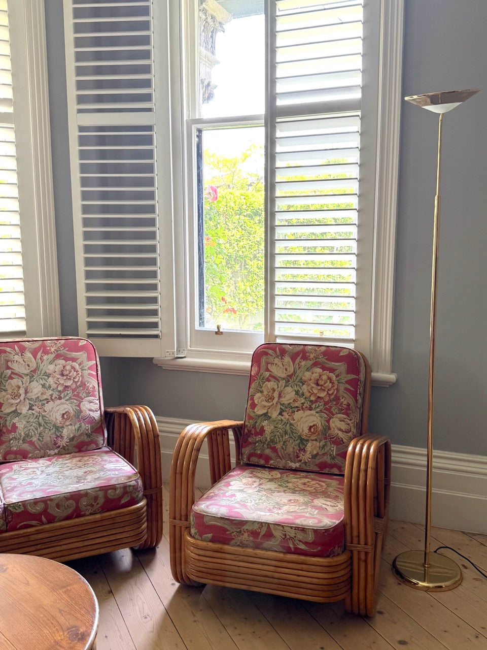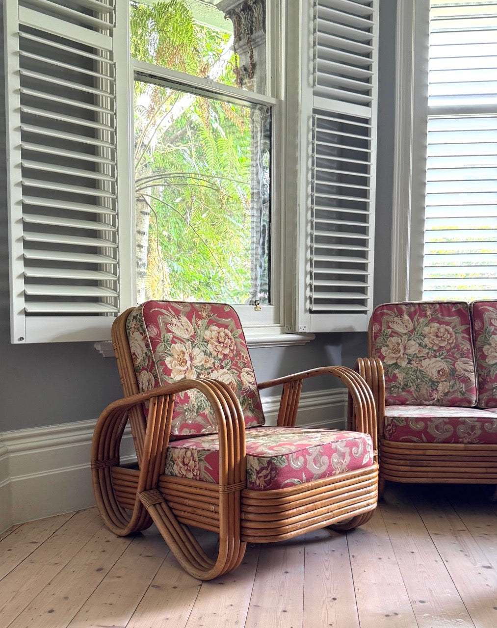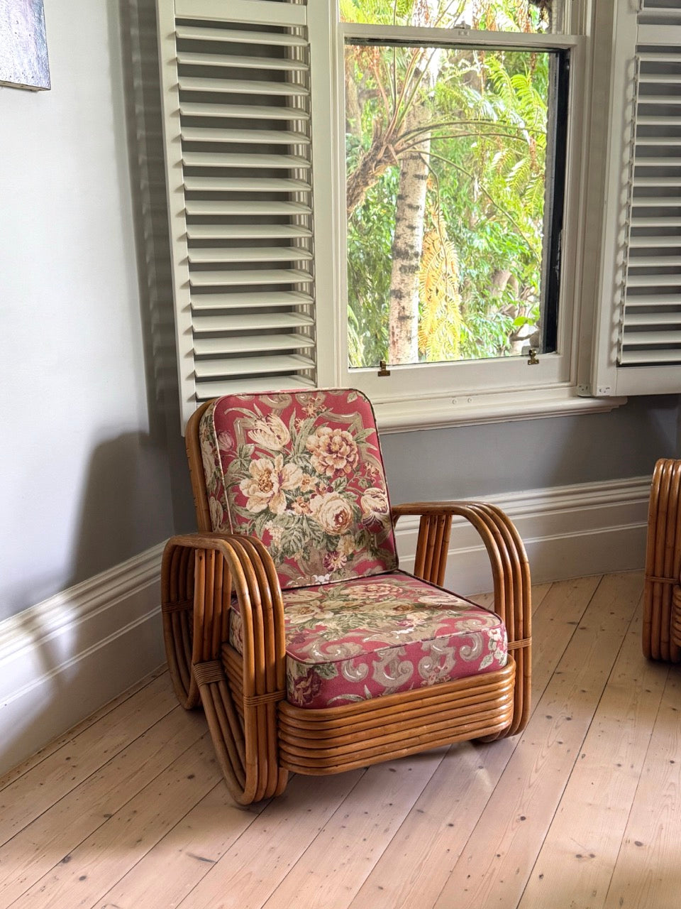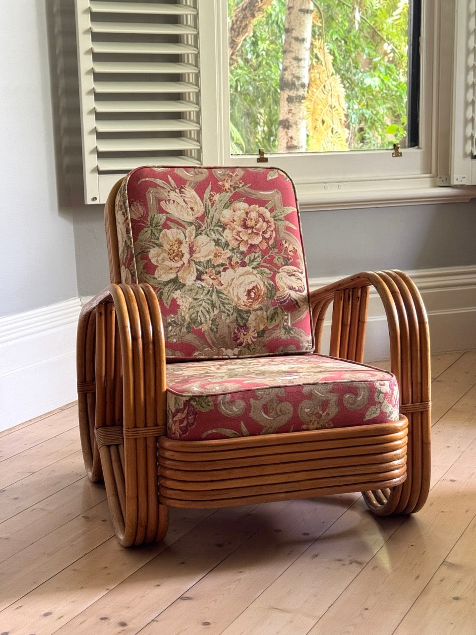Featuring the famous five square-strand pretzel shaped side arms and stacked rattan base. The seats are covered with original floral upholstery.