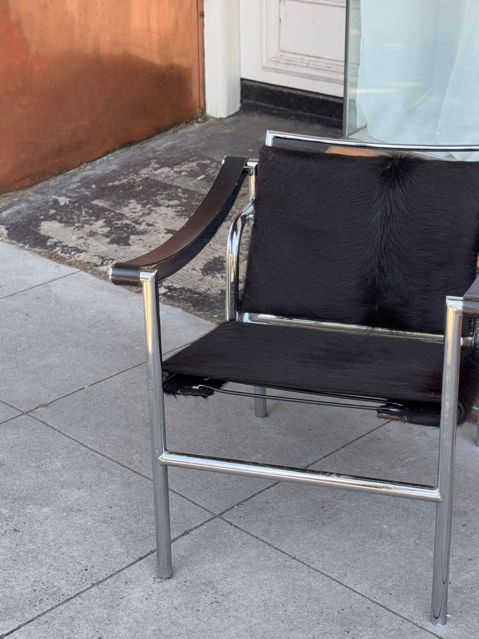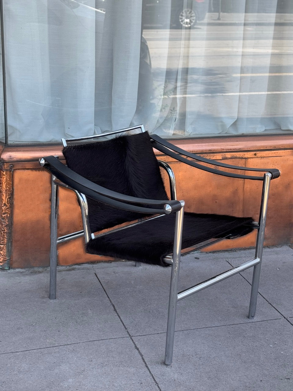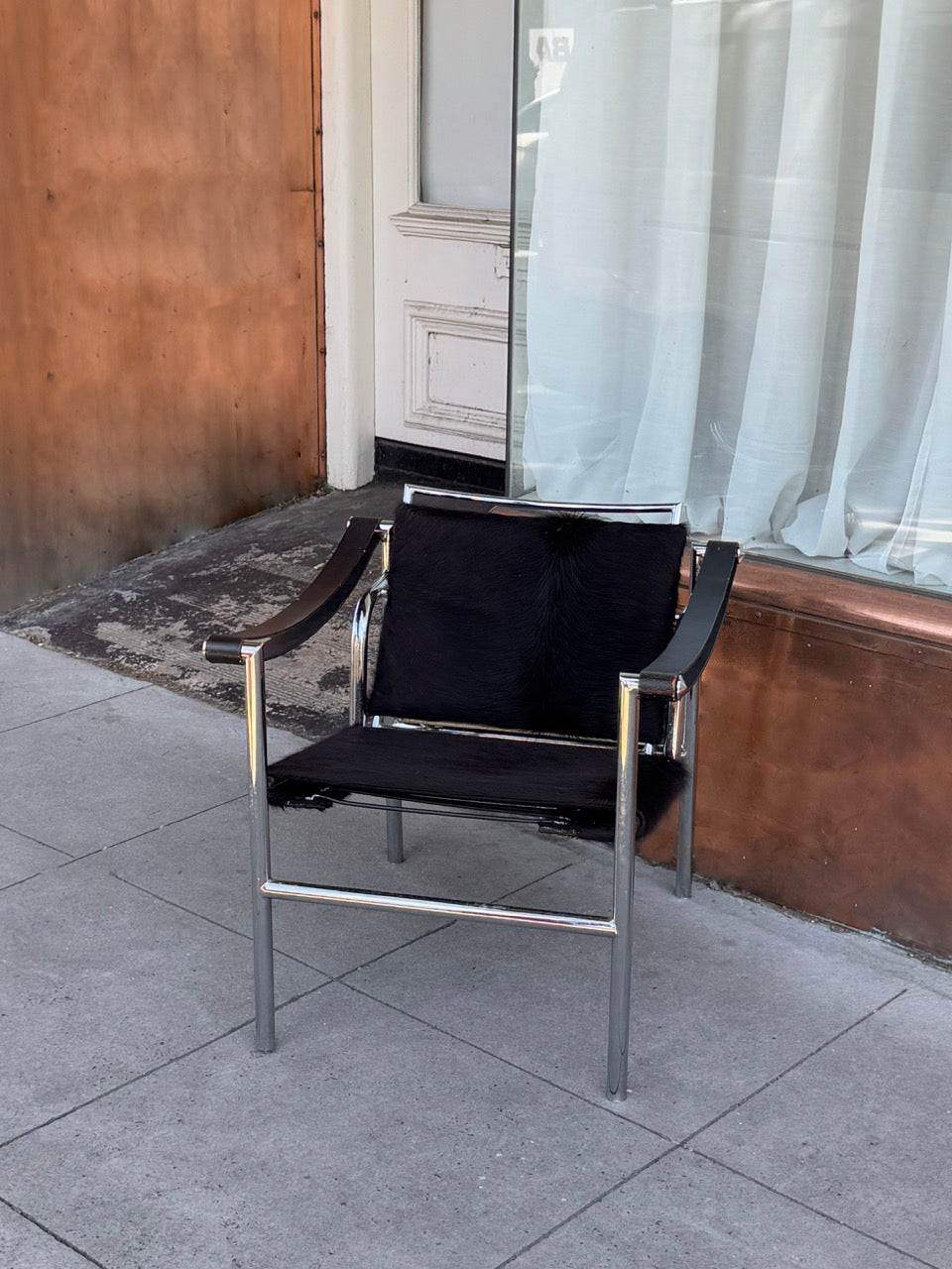 Leather arm rests, chrome legs, cowhide upholstery and a reclining back, which makes this chair a lot more comfortable than at first glance