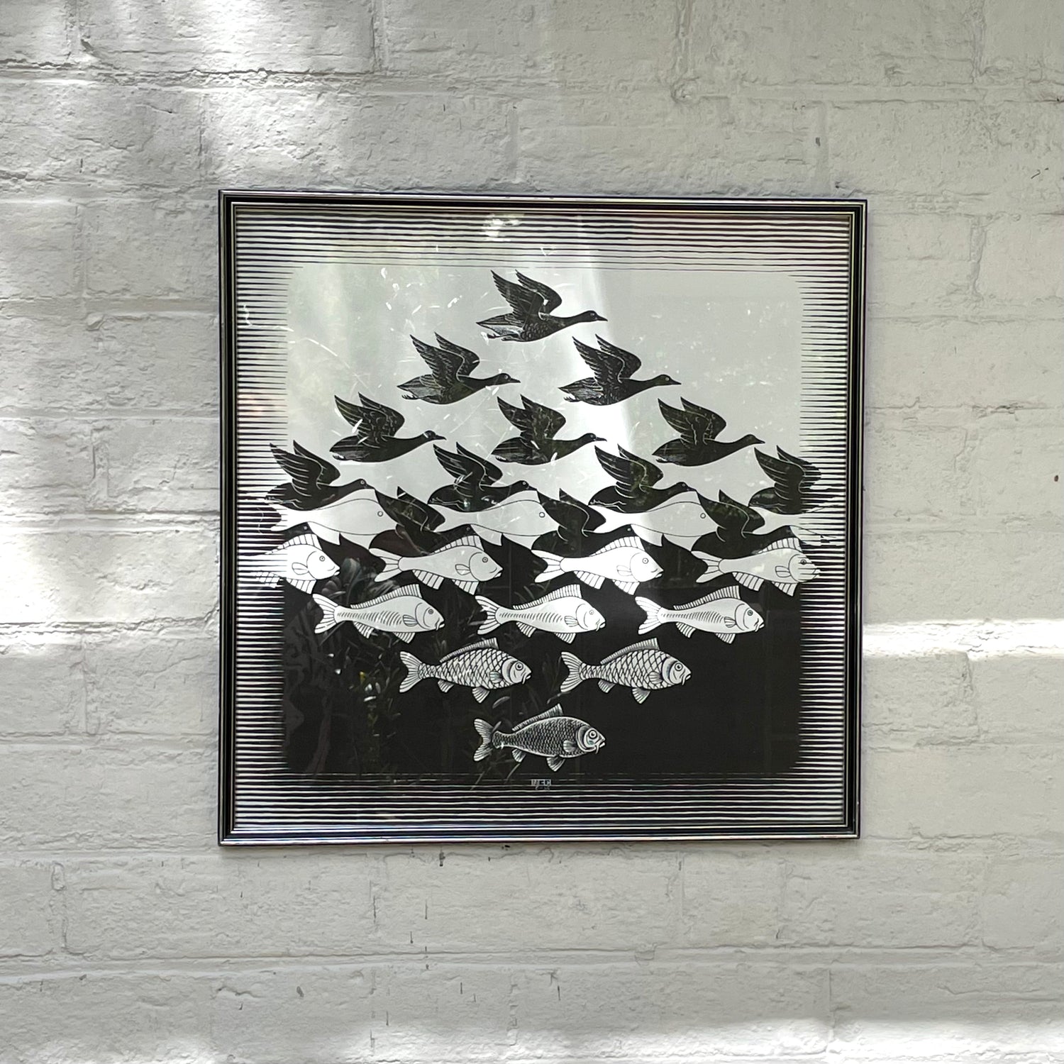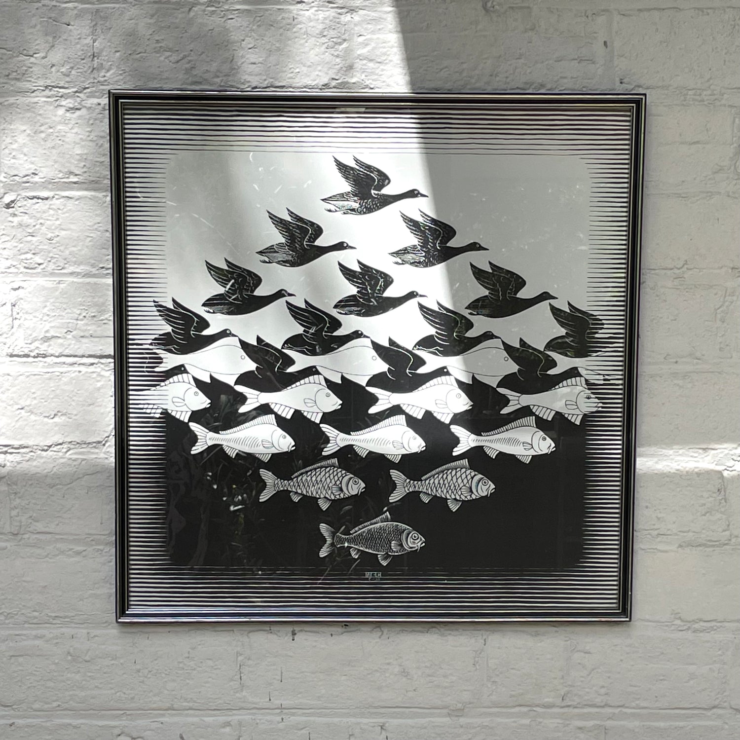 Sky and Water print by M.C Escher set in a black and silver frame.