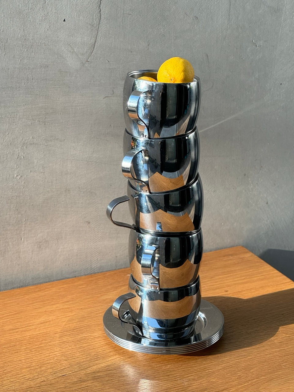 Vintage Tramontina Stainless Steel Tea Cups and Saucers, Brazil