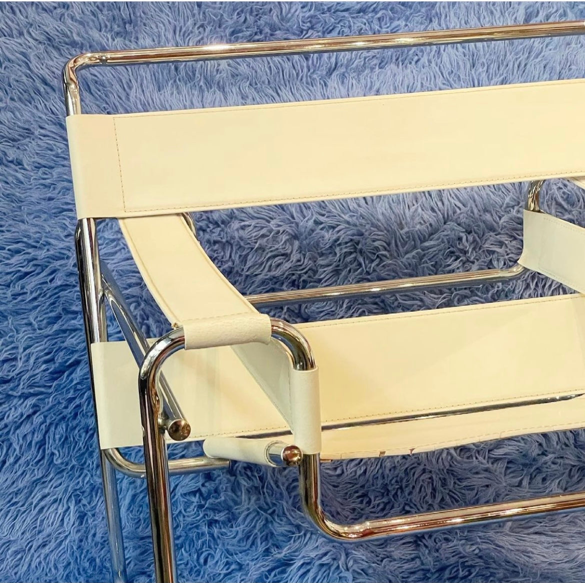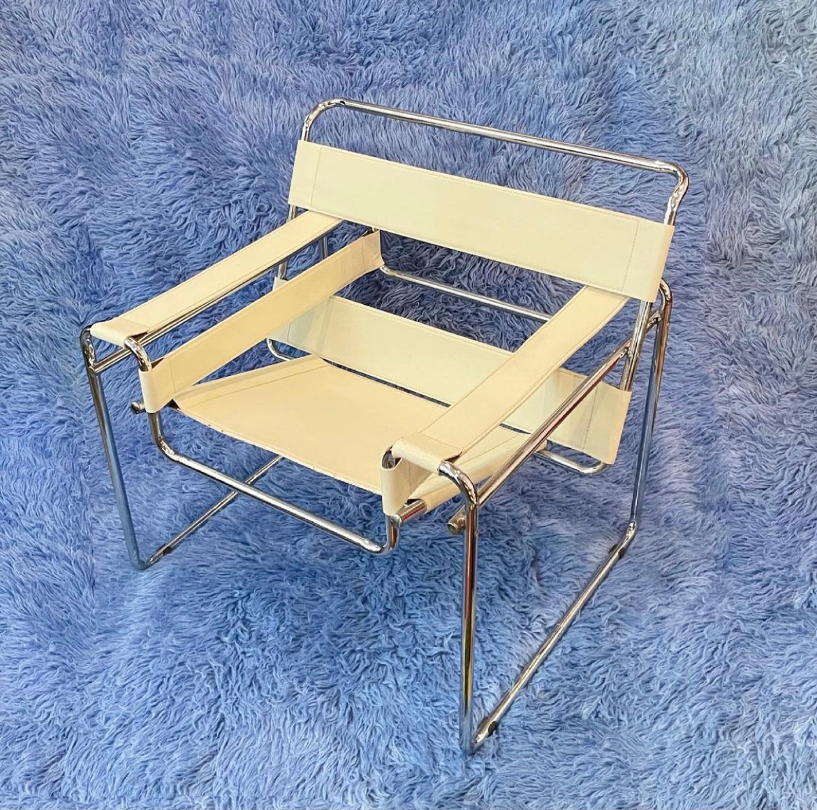 Designed by Marcel Breuer for Knoll. Made of bent tubular steel with a polished chrome finish and leather straps.