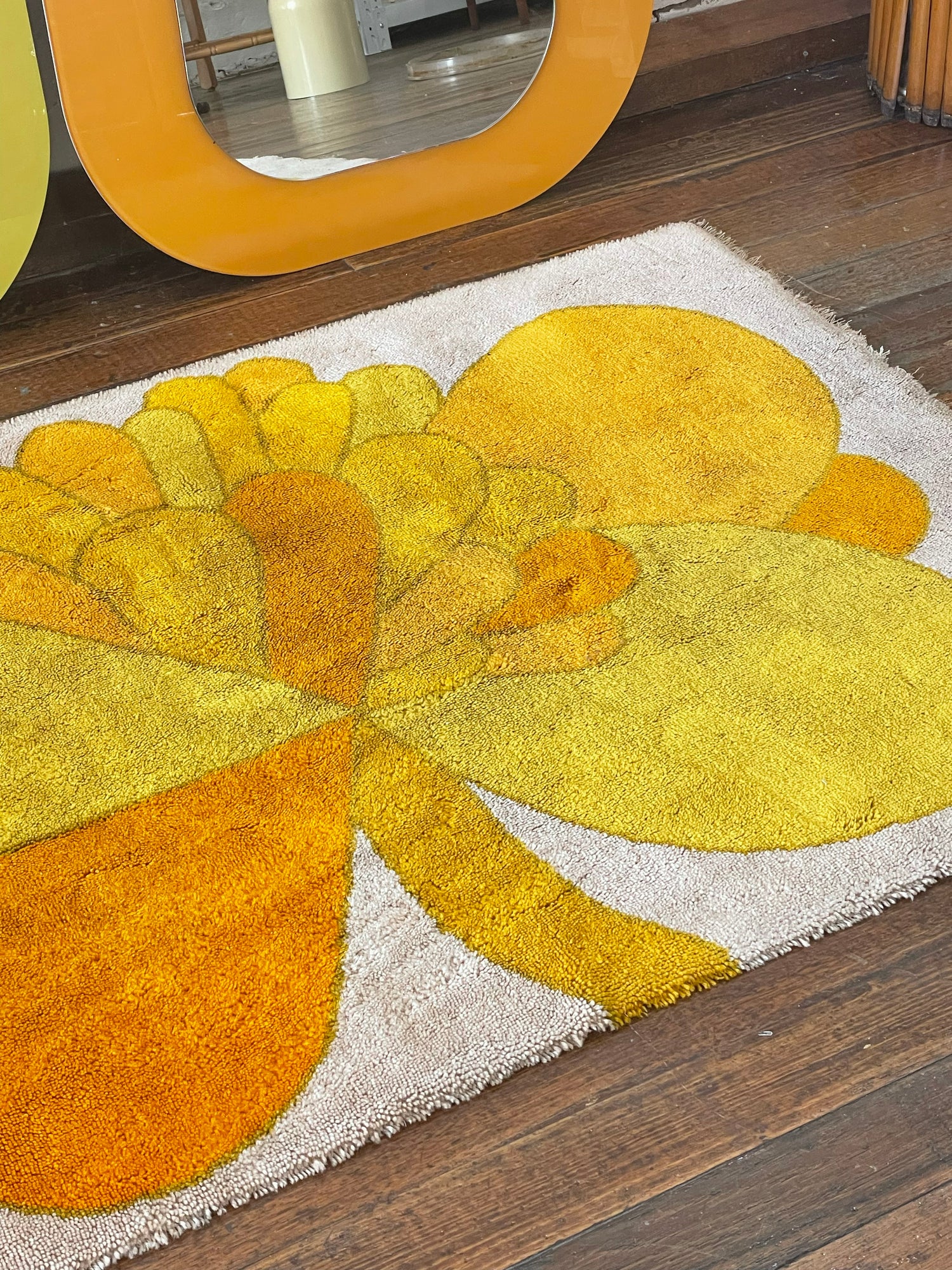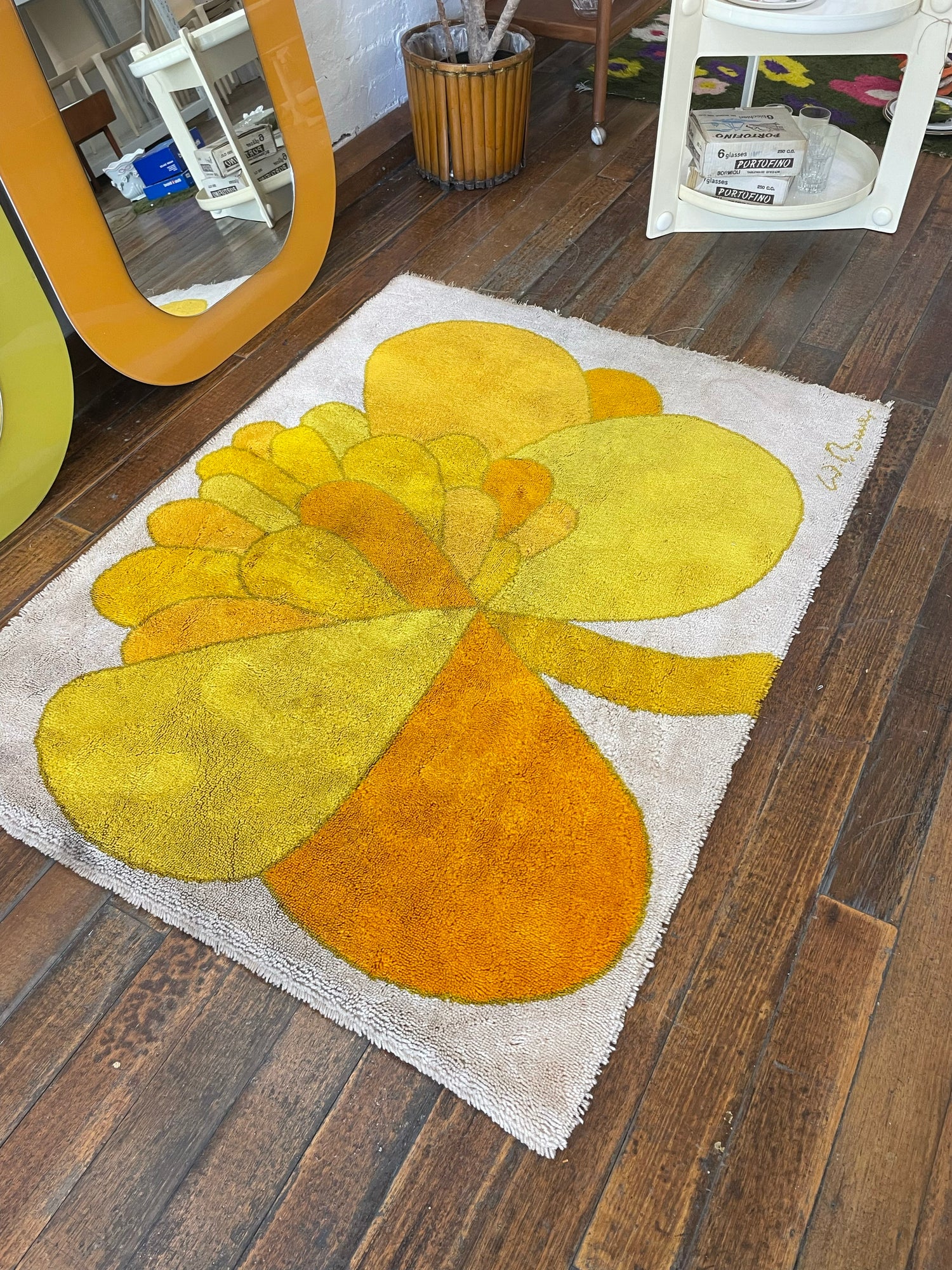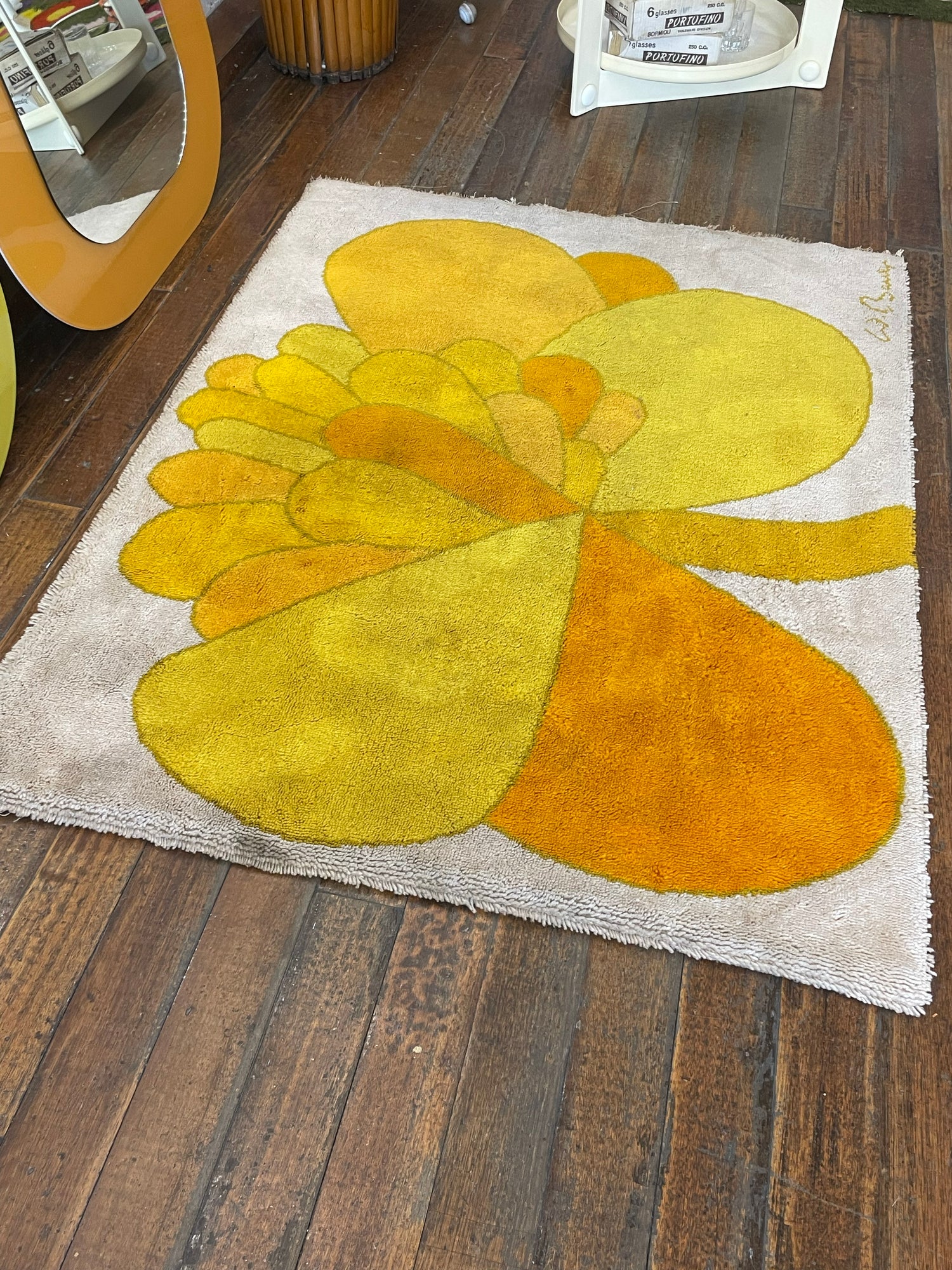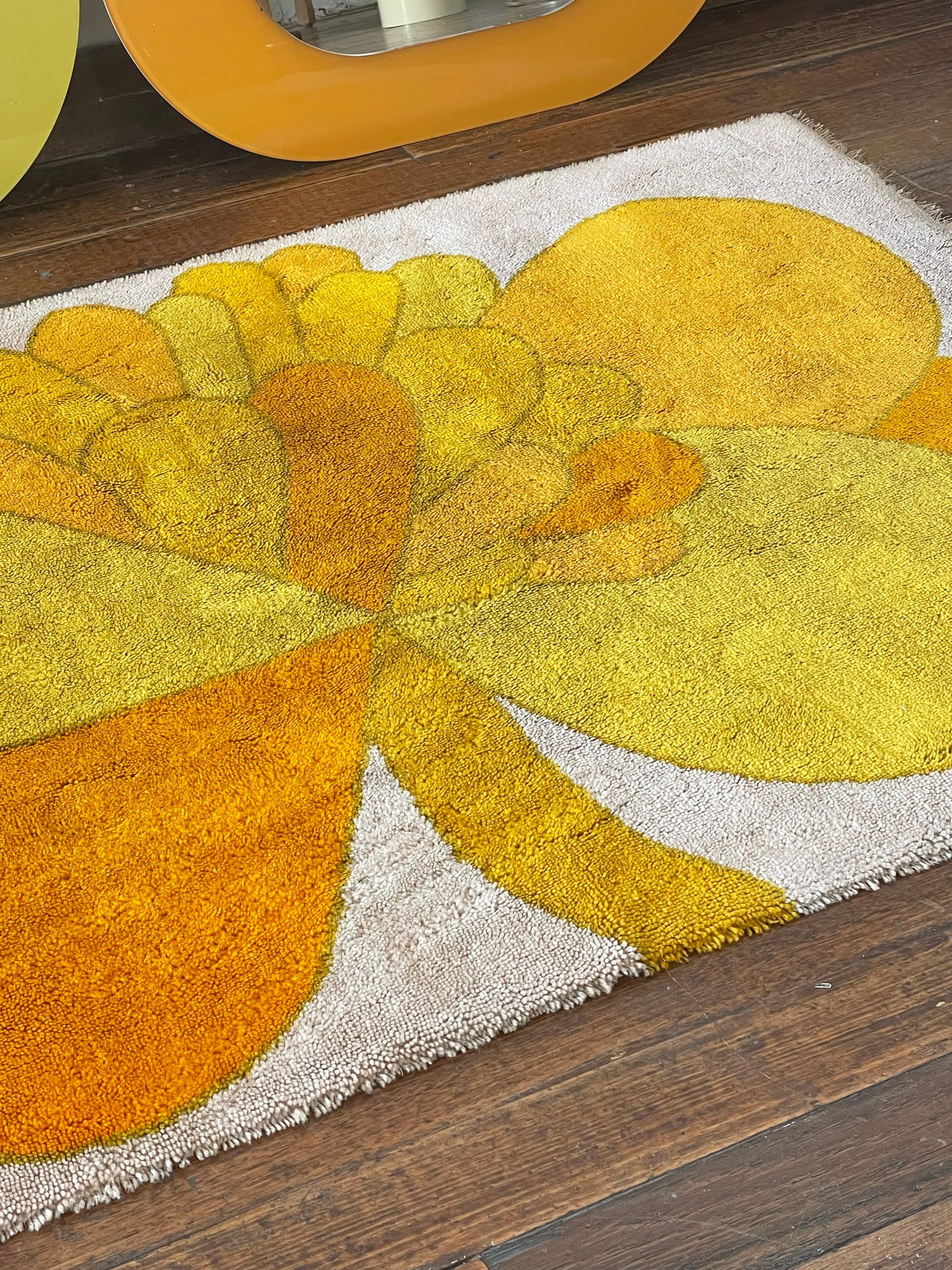 Gorgeous shag rug by Wolf Bauer with a classic 1960-1970s flower print. Cream white background with a flower in shades of orange and yellow. Signed W. Bauer in lower right corner.