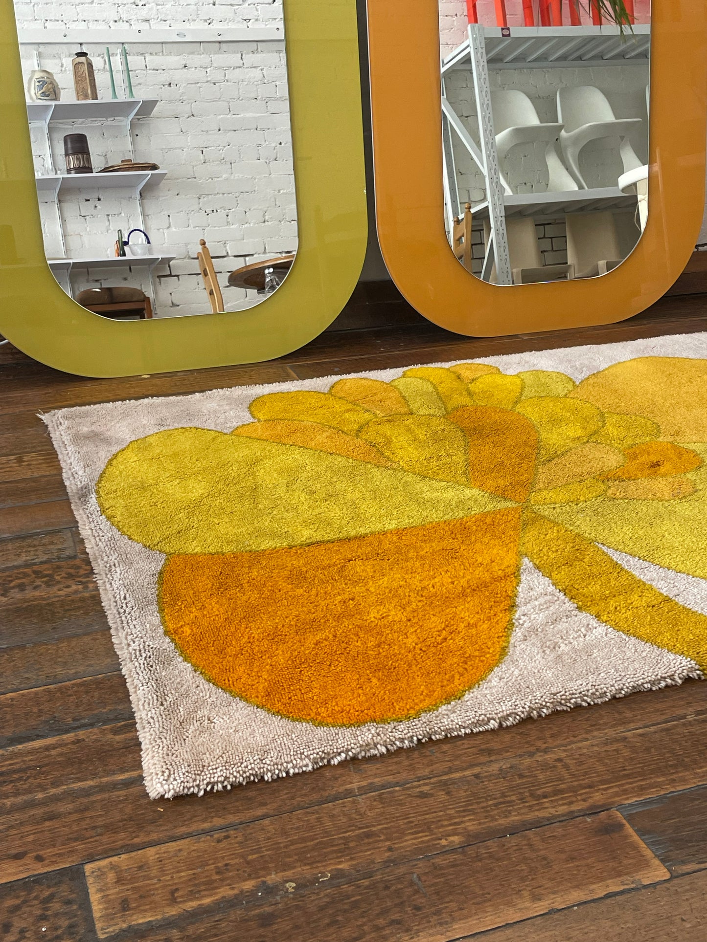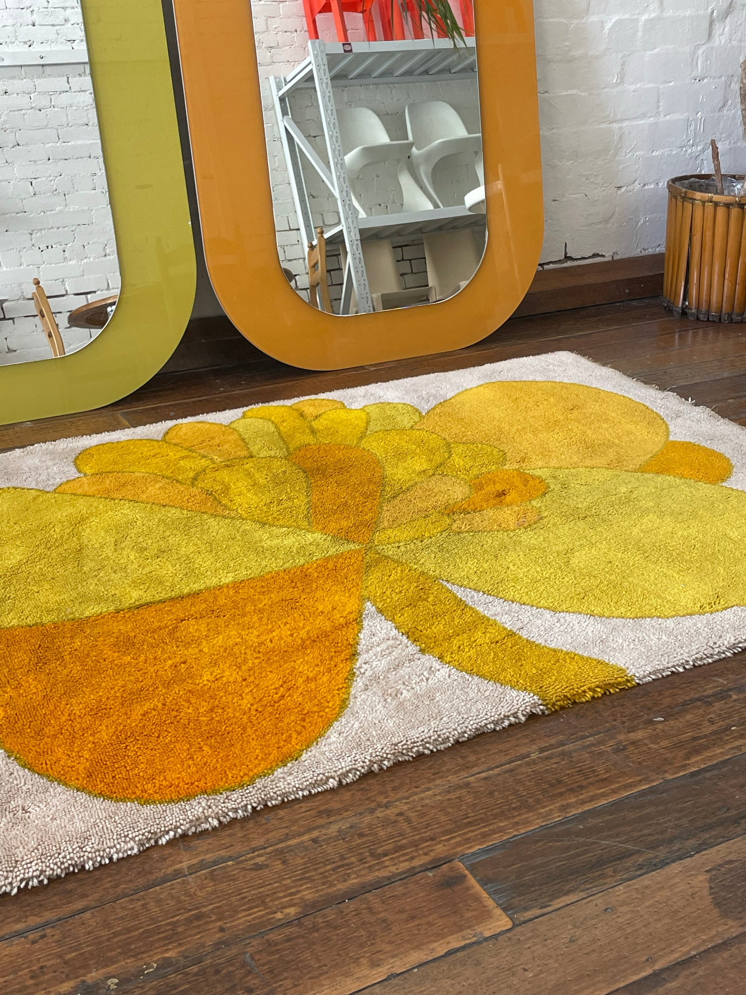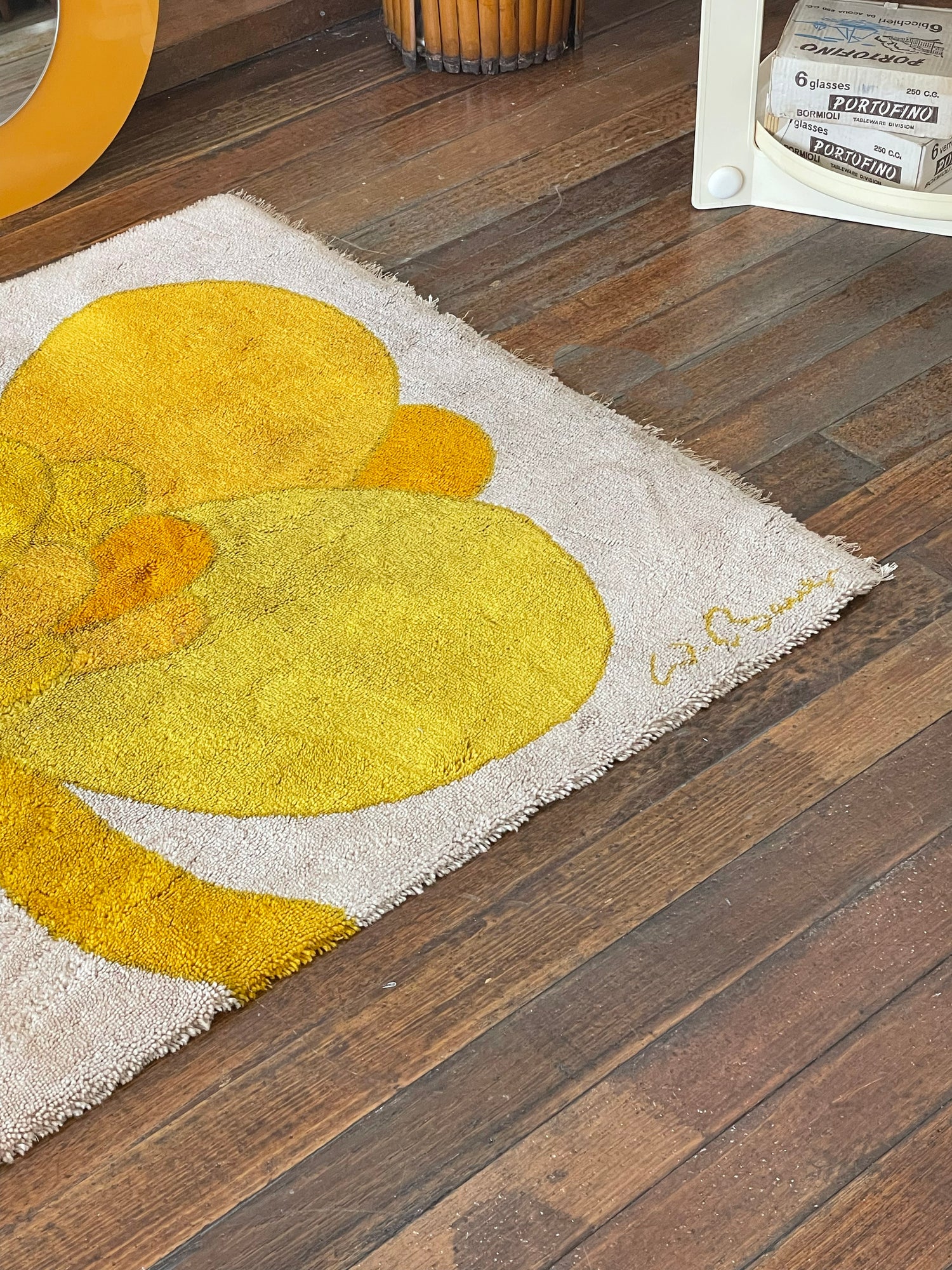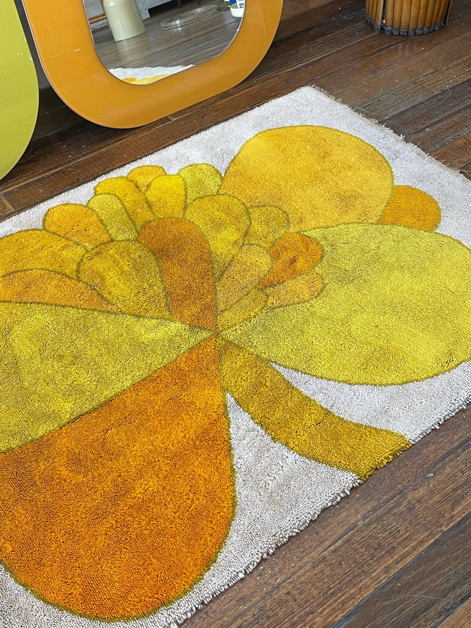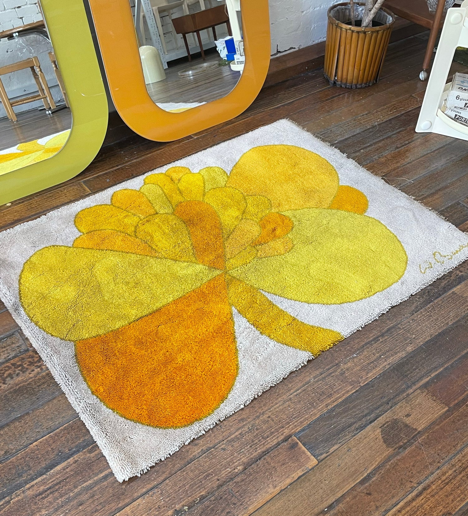 Gorgeous shag rug by Wolf Bauer with a classic 1960-1970s flower print. Cream white background with a flower in shades of orange and yellow. Signed W. Bauer in lower right corner.