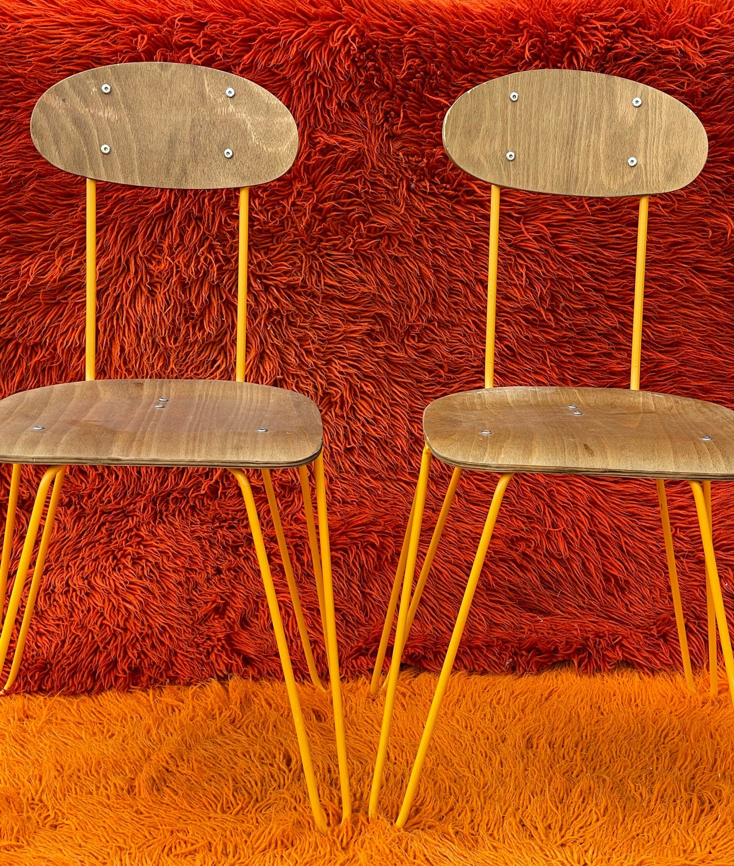 Pair of Wooden Chairs with Orange Chrome Legs