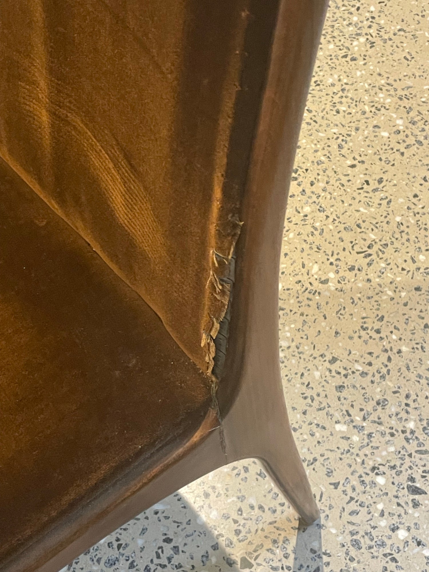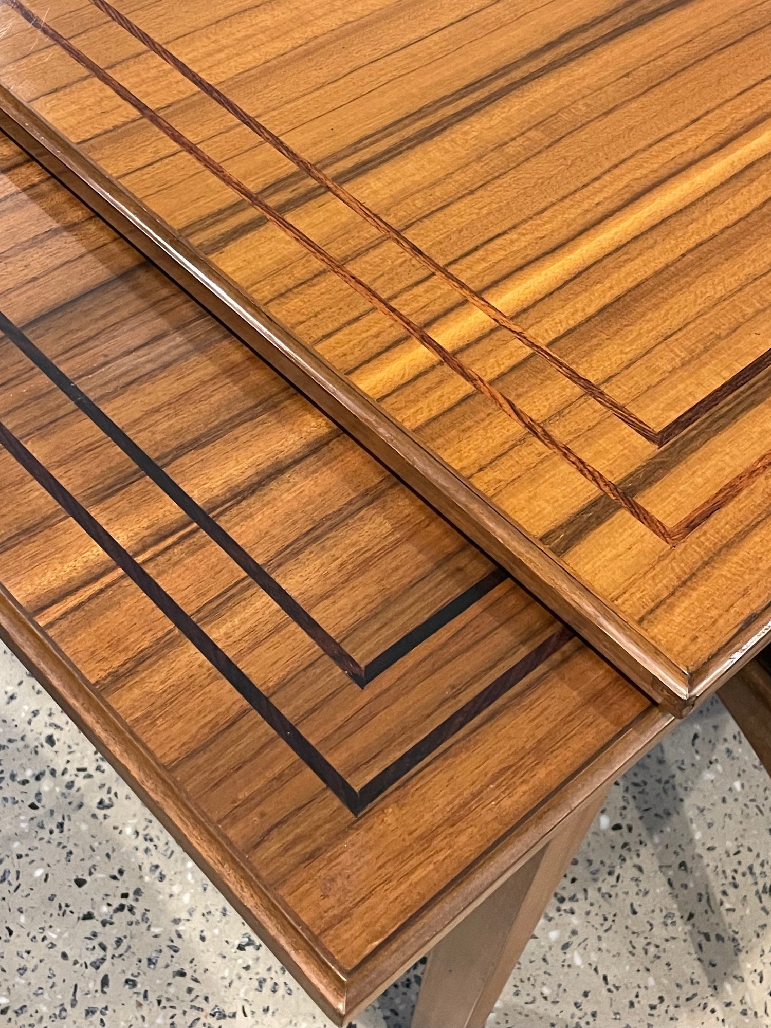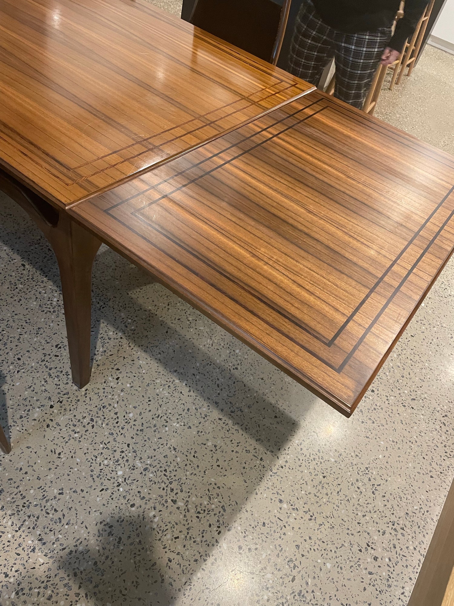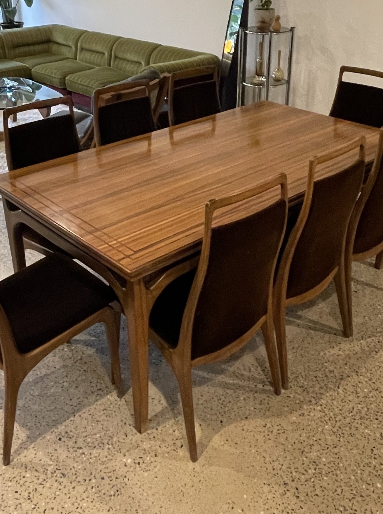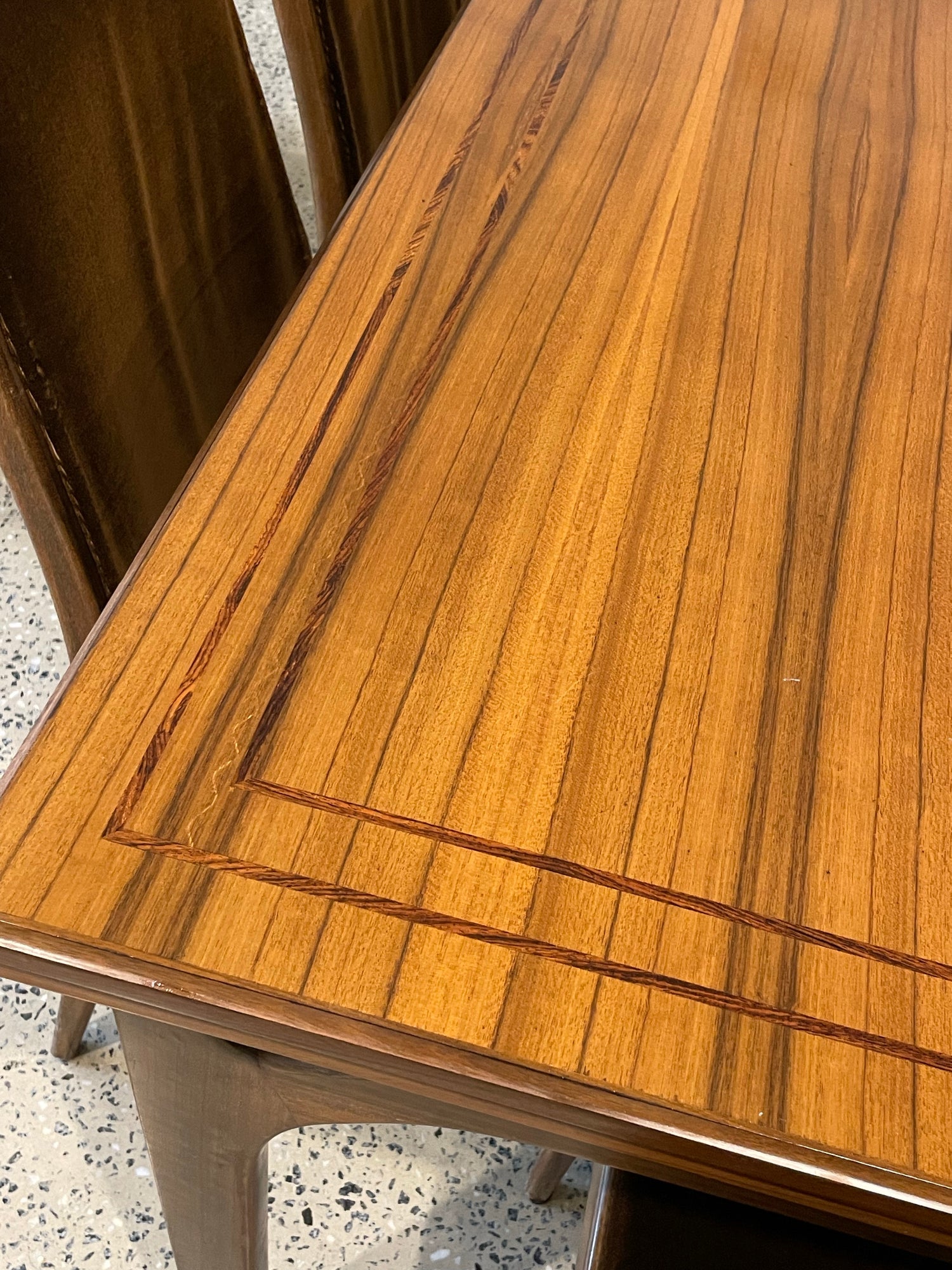 This set is in great vintage condition, The table is beautiful and is only slightly faded in the dark wood inlay (refer to photographs of table extended) one chair has started coming apart slightly at the seem (refer to closeup photograph of chair) other then this, the set is beautiful and would make an amazing addition to any home looking for a special dining set.