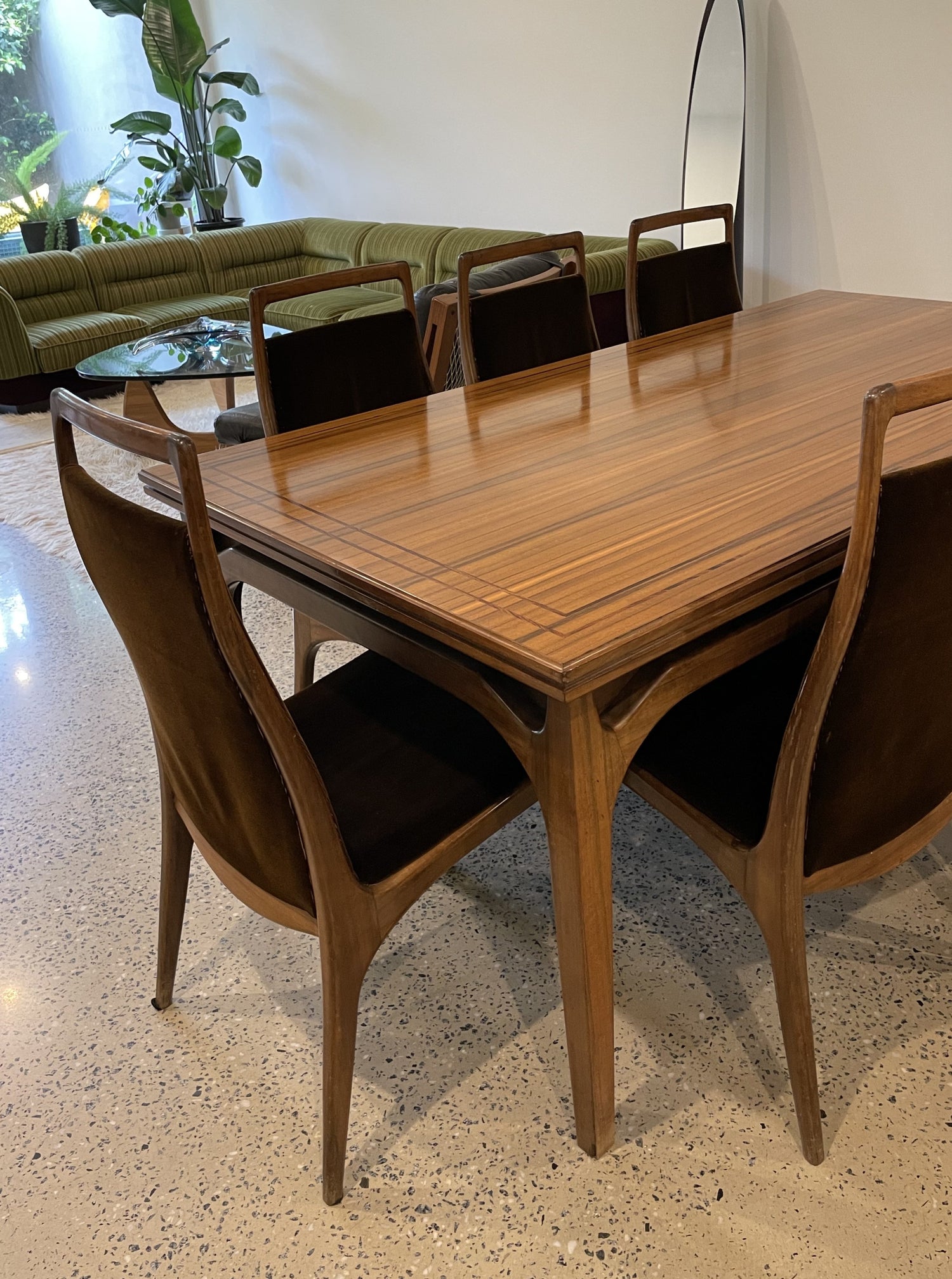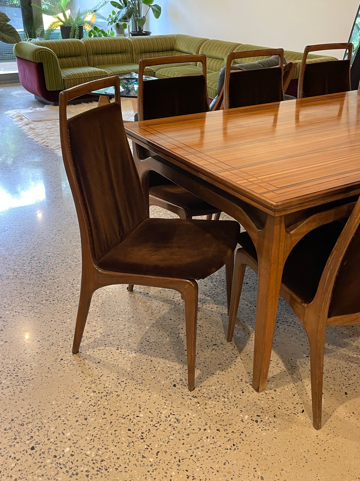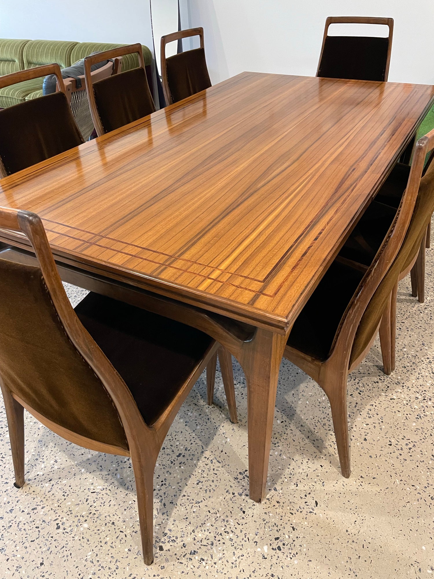An Australian Teak Dining Table with Dark Wood string inlay around the edge. This stunning piece features applied decoration and wishbone legs. 8 brown velvet dining chairs are also included, they are designed in classic Zoureff style.