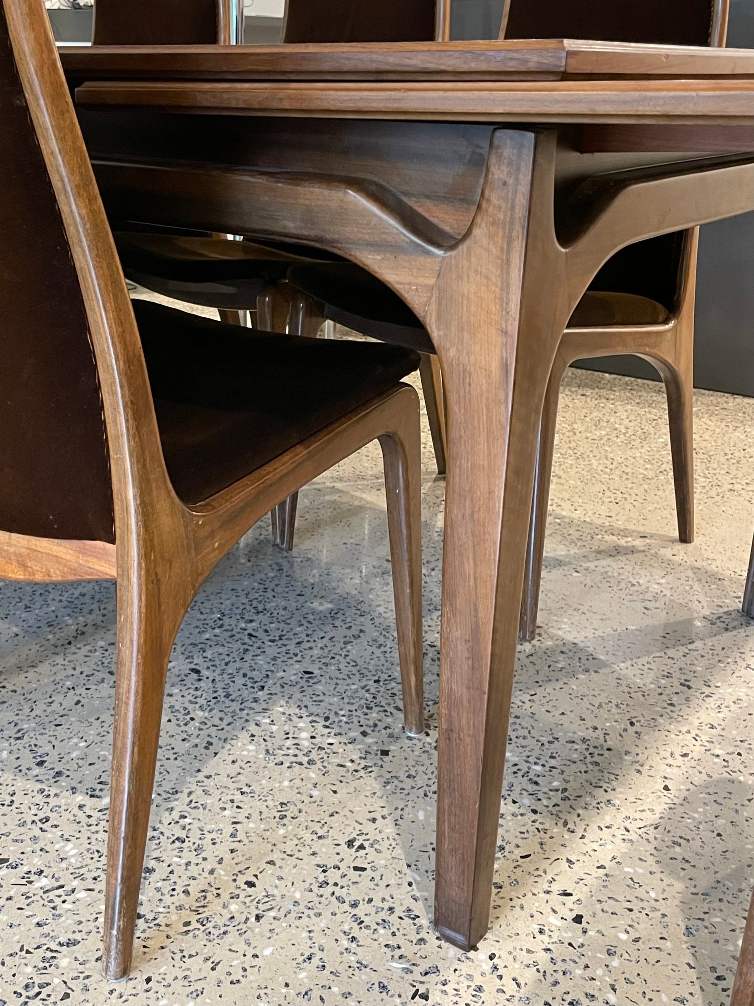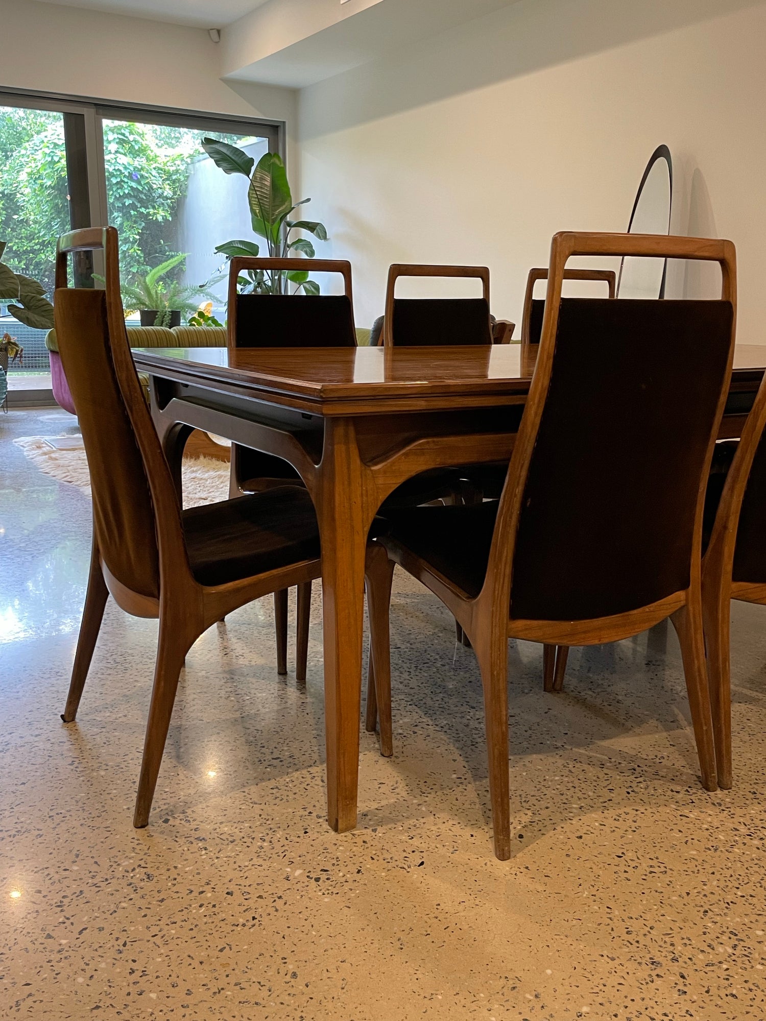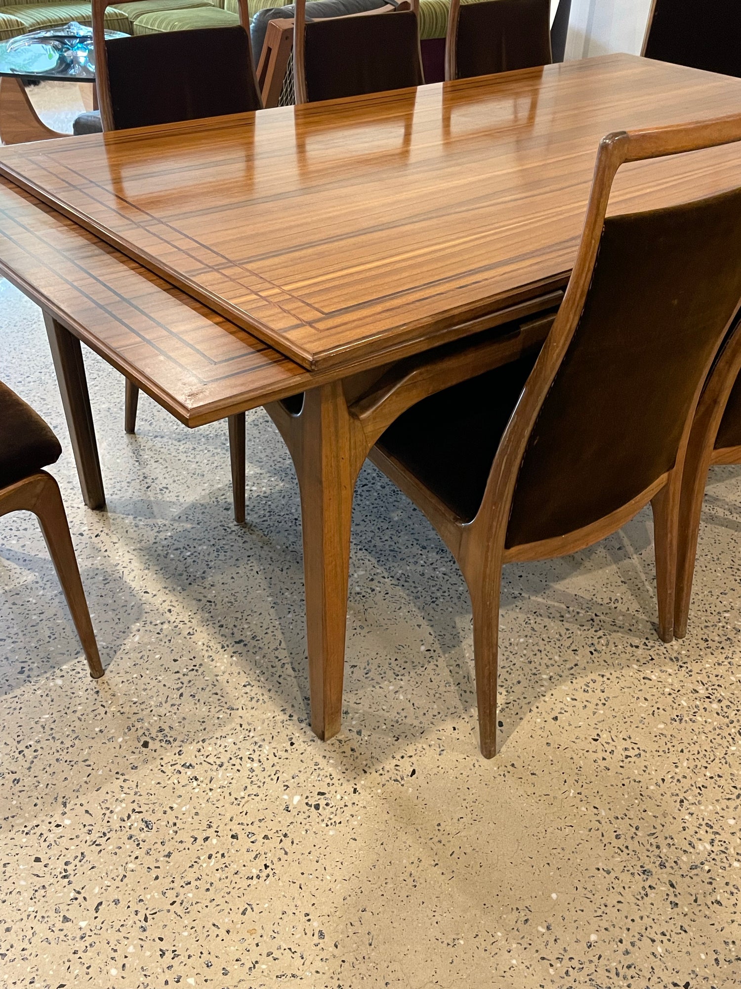 An Australian Teak Dining Table with Dark Wood string inlay around the edge. This stunning piece features applied decoration and wishbone legs. 8 brown velvet dining chairs are also included, they are designed in classic Zoureff style.
